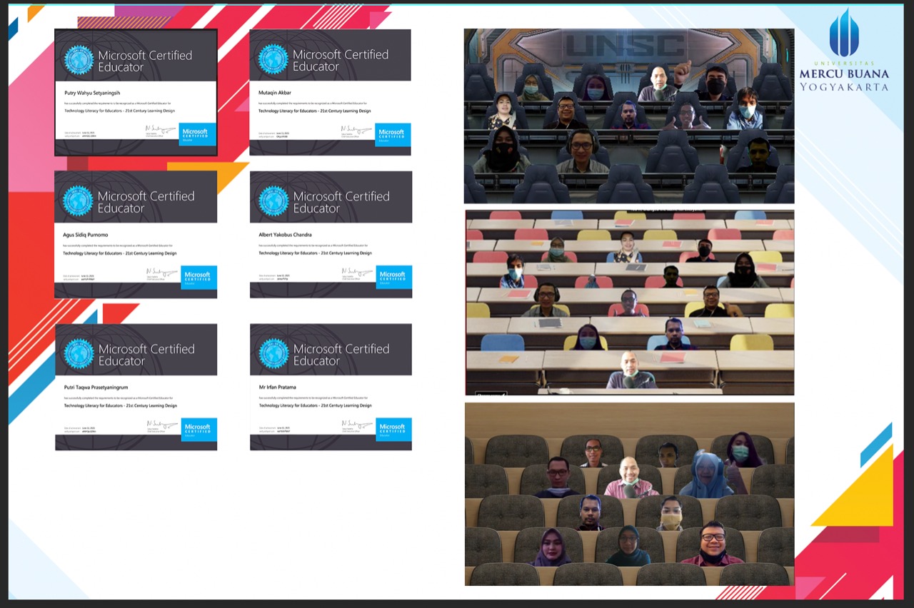Dosen Program Studi Sistem Informasi dan Informatika, Fakultas Teknologi Informasi (FTI) Universitas Mercu Buana Yogyakarta (UMBY) yaitu Anief Fauzan Rozi,S.Kom.,M.Eng, Putri Taqwa Prasetyaningrum,S.T.,M.T, Agus Sidiq Purnomo,S.Kom.,M.Eng., Irfan Pratama,S.Kom.,M.Eng., Albert Yakobus Chandra,S.Kom.,M.Eng., Putry Wahyu Setyaningsih.,S.Kom.,M.Kom, dan Mutaqin Akbar,S.T,M.T, telah meraih prestasi membanggakan. Mereka dinyatakan lulus sertifikasi internasional dan berhak menyandang gelar Microsoft Certified Educator (MCE). Pelatihan MCE diselenggarakan 7 – 9 Juni 2021, dan ujian dilaksanakan pada tanggal 11 Juni 2021.