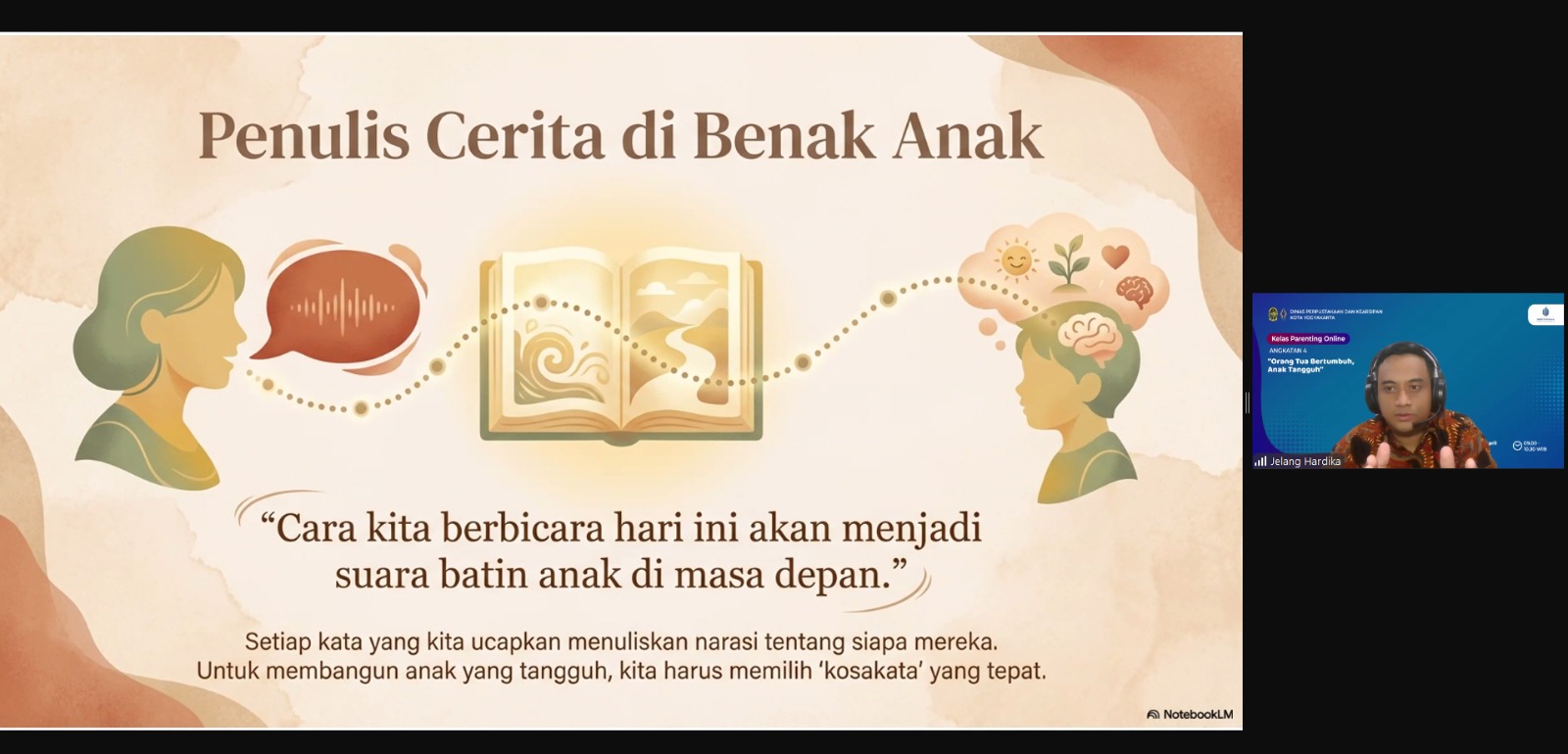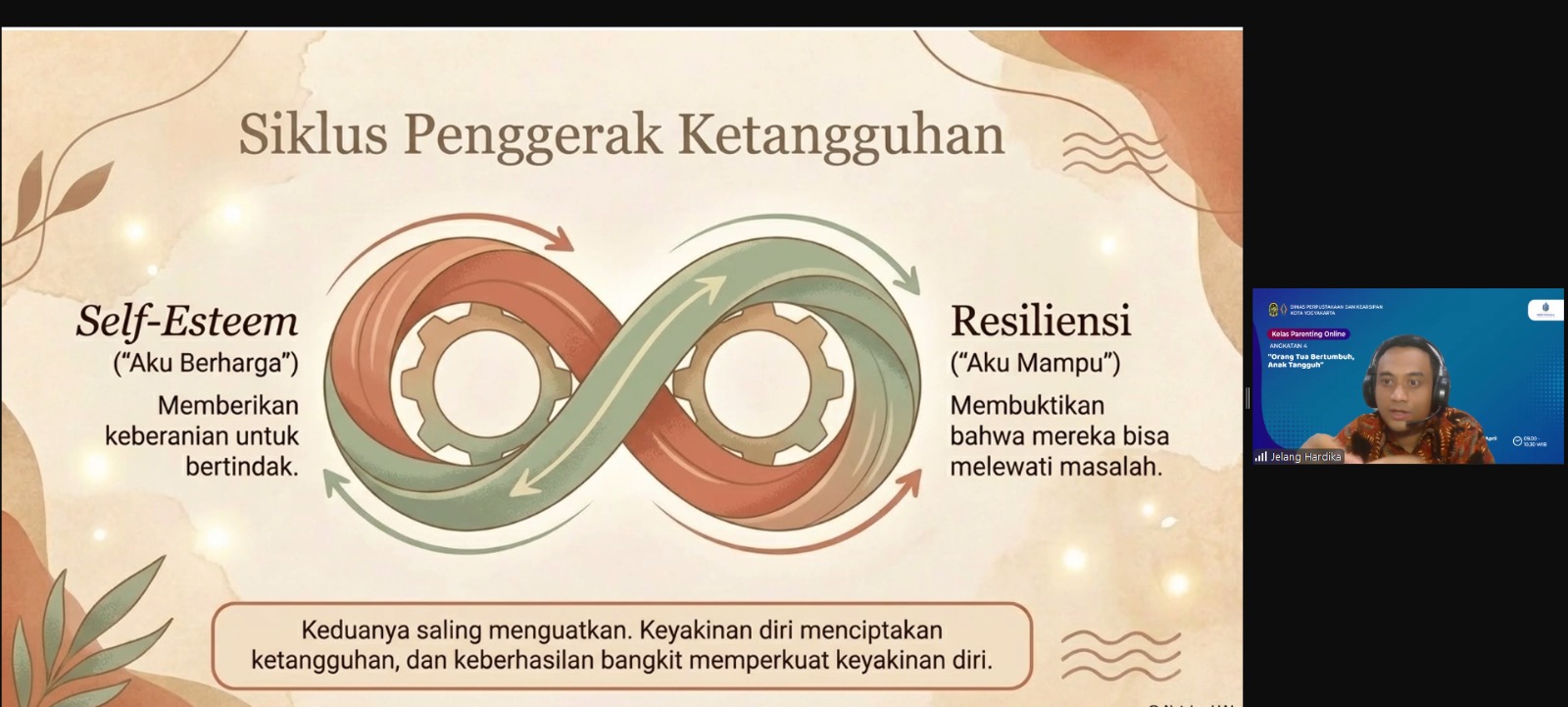 Dalam pemaparannya, Jelang menjelaskan bahwa cara orang tua berinteraksi dengan anak sehari-hari memiliki dampak jangka panjang terhadap pembentukan self-esteem dan resiliensi anak.