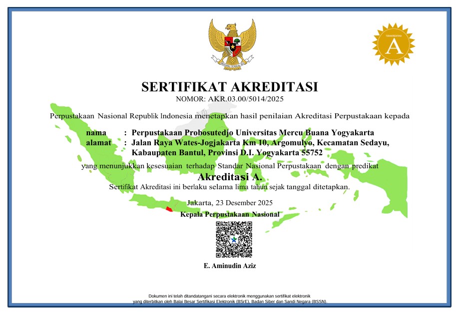 Perpustakaan Probosoetedjo Universitas Mercu Buana Yogyakarta (UMBY) kembali mencatatkan prestasi gemilang dengan mempertahankan predikat akreditasi A. Status tersebut tertuang pada sertifikat akreditasi dari Perpustakaan Nasional Republik Indonesia (Perpusnas RI) dengan nomor : AKR.03.00/5014/2025 yang berlaku selama lima tahun. Pencapaian ini merupakan bukti dari kualitas dan komitmen perpustakaan dalam menyediakan layanan yang unggul, inovatif, dan relevan sehingga berwawasan internasional serta berperan aktif dalam pengembangan literasi informasi.