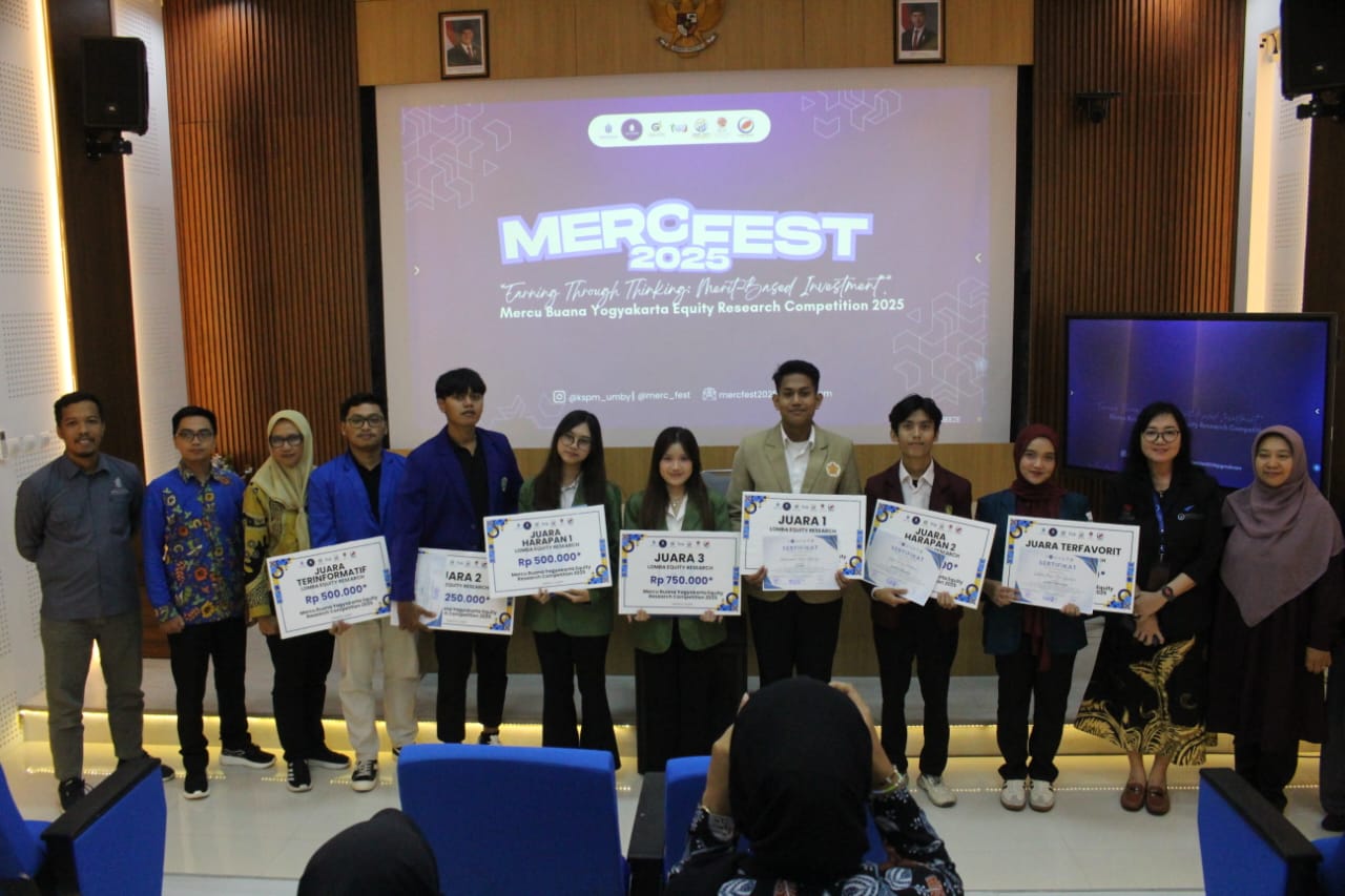 Dalam rangka Dies Natalis ke-39 Fakultas Ekonomi Universitas Mercu Buana Yogyakarta (UMBY) bersama Galeri Investasi UMBY dan Kelompok Studi Pasar Modal (KSPM) UMBY sukses menyelenggarakan ajang kompetisi MERCFEST 2025: Equity Research Competition. Kegiatan ini diikuti oleh 28 kelompok mahasiswa dari berbagai universitas di seluruh Indonesia. Kompetisi ini menjadi wadah bagi mahasiswa untuk mengasah kemampuan analisis pasar modal, riset keuangan, dan strategi investasi saham berbasis data riset fundamental serta valuasi yang komprehensif.